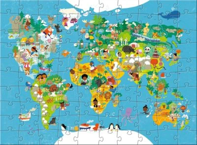 Tolles Puzzle mit 100 XL Teilen, das eine kindlich gestaltete Weltkarte zeigt.