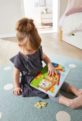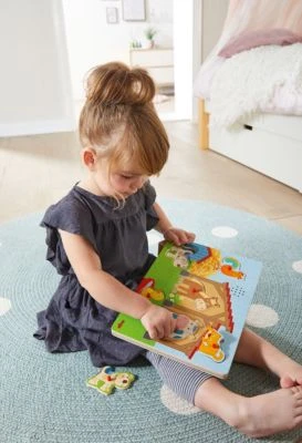 Willkommen auf dem Land. Hier wohnen das Pferd, die Kuh, der Hahn und ihre tierischen Freunde. Gemeinsam erleben sie viele spannende Abenteuer. Wird eines der 6 Holzteile richtig eingepuzzelt, ertönt die entsprechende Tierstimme. Das macht Spaß und unterhält die Kleinen lange.