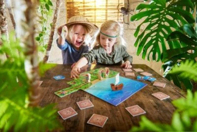 Gemeinsam machen sich die Spieler auf die abenteuerliche Suche nach den Schätzen im Dschungel der Insel Karuba! Schaffen sie es, die Weg-Plättchen so anzulegen, dass sie alle Schätze erreichen, bevor die fiesen Piraten die Insel überfallen? Dafür müssen sie gut zusammenarbeiten und sich vor den Tigern in Acht nehmen, die den Weg versperren. Mit Glück und Köpfchen werden sie schneller sein als die Piraten!