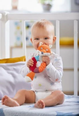 HABA Greifling Fuchs Foxie. Dieser niedliche Fuchs lädt zum Spielen und Entdecken ein und der wunderbar weiche Greifring ist für kleine Kinderhände gut zu fassen.