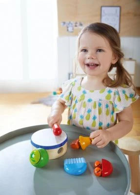 HABA Klangspiel-Set. Kinder lieben es, selbst Musik zu machen Mit dem Klangspiel-Set macht das Musizieren besonders viel Spaß, denn mit Trommel, Rassel, Glocke und Klingel lassen sich die unterschiedlichsten Klänge und Melodien erzeugen. So werden auch die Kleinsten schon spielerisch an das Thema Musik herangeführt.