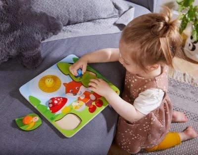 Bei dem Greifpuzzle „Fuchs“ von Haba lässt sich das Bild durch vier einsetzbare Puzzleteile vervollständigen. Zu sehen sind ist ein Fuchs, der im Wald Pilze sammelt. In der Landschaft befinden sich zudem eine Eule, ein Fliegenpilz, die Sonne und eine Schnecke.