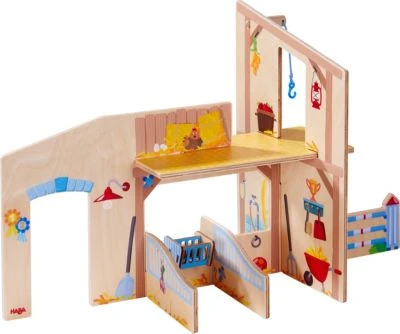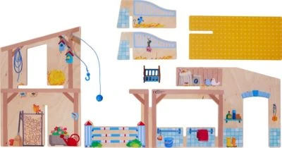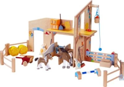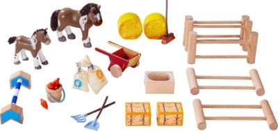 Auf dem Reiterhof Pferdeglück leben die glücklichsten Pferde, denn dort gibt es alles, was das Reiter- und Pferdeherz begehrt: Ein Unterstand mit viel frischem Heu und leckerem Obst, ein Hindernis zum Springreiten und alles Notwendige zum Striegeln und Saubermachen. Da werden alle Wünsche wahr! 213 x 502 x 213 cm