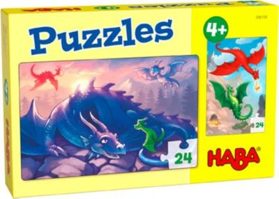 Deckel auf und das Puzzleabenteuer beginnt: Die Puzzles Drachen von HABA nehmen Kinder ab 4 Jahren mit ins Drachen-Gebirge. Dort gibt es farbenfrohe Feuerspucker und Flugakrobaten zu entdecken. Die freundlichen Drachen regen die Fantasie an, animieren zum Erzählen an und fördern die Kommunikation kleiner Puzzle-Freunde. Das Puzzle-Set enthält zwei klassische Puzzles mit je 24 Teilen aus stabiler Pappe. Die farbenprächtige Gestaltung hilft beim Zuordnen der Teile. Spielerisch trainieren Kinder mit den faszinierenden HABA Puzzles ihre Feinmotorik und Konzentration. Spielend lernen mit HABA.