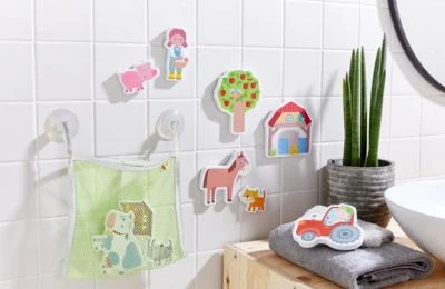 Mit diesem tollen Badespielzeug aus dem Hause Haba macht das Planschen in der Wanne besonders großen Spaß! Die verschiedenen Teile halten mit Saugnäpfen auf glatten Oberflächen und können auf dem Wasser schwimmen. So wird es kleinen Entdecker*innen auch beim täglichen Bad nicht langweilig!